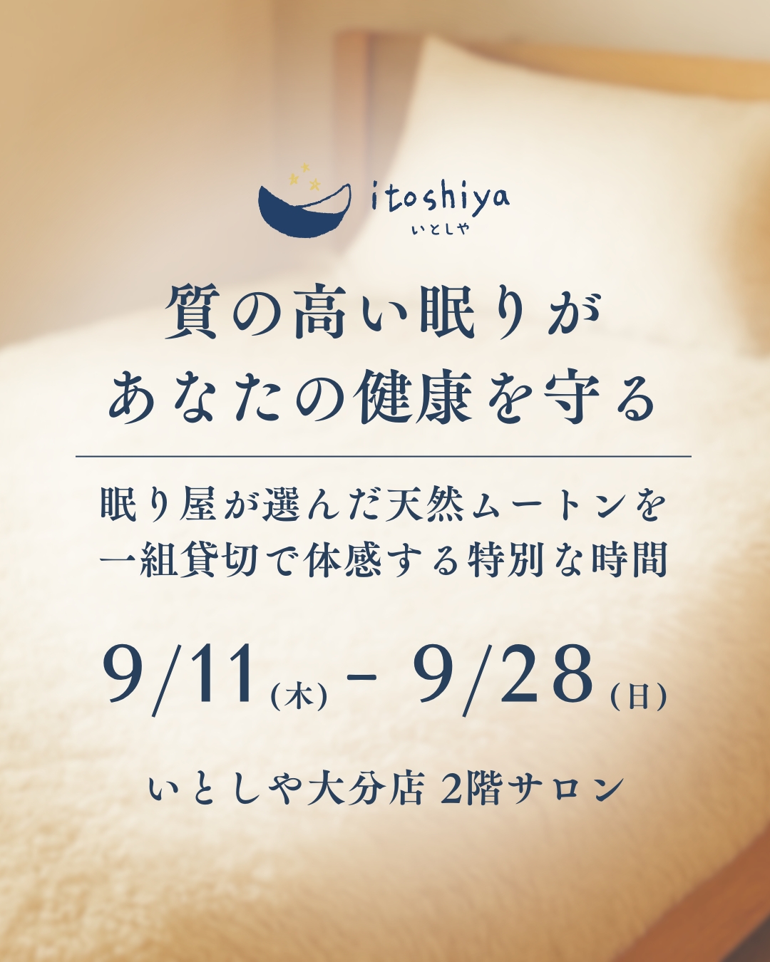 【いとしや大分店】健康を支える眠りを、ムートンで。 一組貸切でゆったり体感する特別な時間・9/11(木)~9/28(日)UPDATE. 2025.9.04